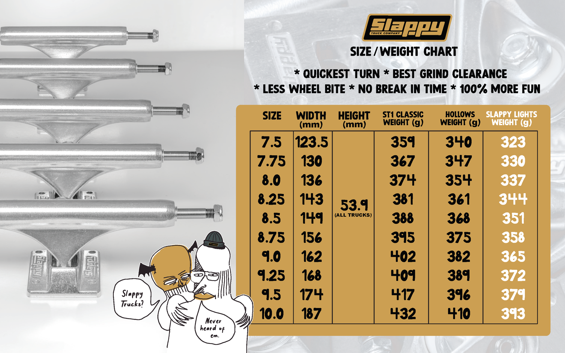 Redefining grind possibilities with their innovative kingpin design, the Slappy ST1 Inverted Skateboard Trucks are built to maximize clearance and enhance your grinds. Slappy's inverted kingpin design places the kingpin nut under the baseplate, offering more grind clearance allowing you to lock into grinds with ease. Featuring a hollow kingpin and axle for reduced weight without sacrificing durability. Sold as a set of two in multiple sizes.